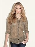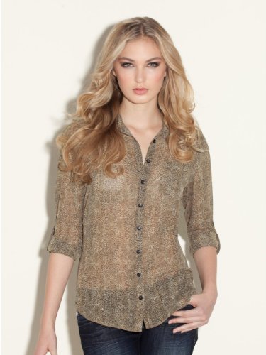 Define your wild side with this ultrachic leopard button-up blouse. Wear it with a black bandage skirt or dark-washed jeans to get serious style with a playful attitude. ? Georgette blouse with shirt collar and long sleeves ? Leopard pattern. Button-tab detail at shoulders and sleeve cuffs. Patch pocket at left bust. Shirttail hem. ? Front button closures ? 100% Polyester ? Hand wash Women > Tops > Button Down Shirts